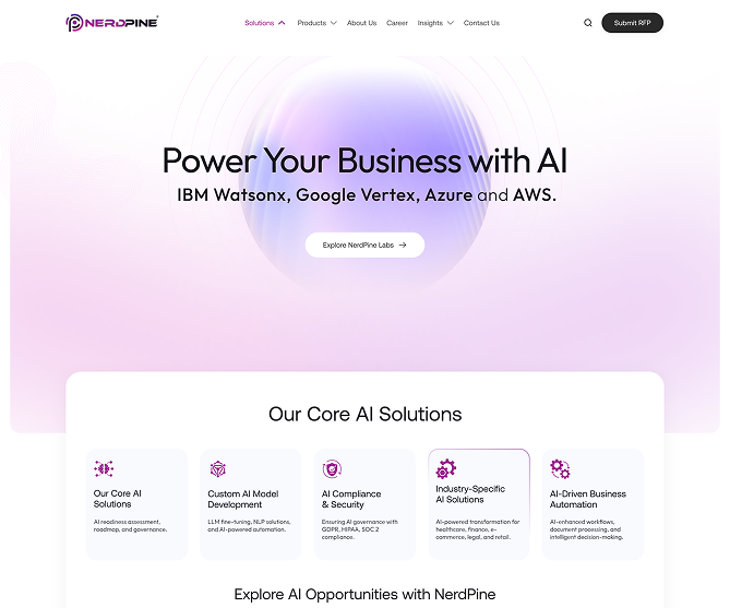 NerdPine is a leading AI consulting company that provides intelligent automation, cloud-based AI solutions, and open-source integrations to global businesses. Their services span across industries including healthcare, finance, retail, and e-commerce.